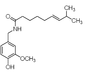 別名   辣椒堿 ;天然辣椒素,(E)-N-(4-羥基-3-甲氧基芐基)-8-甲基-6-壬烯酰胺 ;E)-N-[(4-Hydroxy-3-methoxyphenyl)methyl]-8-methyl-6-nonenamide
