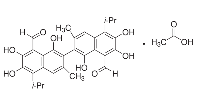 別名 醋酸棉酚;1,1',6,6',7,7'-Hexahydroxy-3,3'-dimethyl-5,5'-bis(1-methylethyl)[2,2'-binaphthalene]-8,8'-dicarboxaldehyde-acetic acid