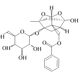 別名 芍藥苷 ;芍藥甙 ;5beta-[(Benzoyloxy)methyl]tetrahydro-5-hydroxy-2-methyl-2,5-methano-1H-3,4-dioxacyclobuta[cd]pentalen-1alpha(2H)-yl-beta-D-glucopyranoside