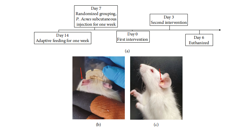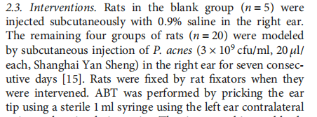 2. Experimental Grouping. After 1 week of acclimatization, the 25 SD rats were randomly divided into five groups: blank control group (control), acne model group (acne), auricular bloodletting therapy (ABT), auricular point sticking (APS),and auricular bloodletting therapy combined with auricular point sticking (ABPS).