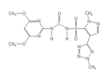 別名  1-((4,6-二甲氧基嘧啶-2-基)-3-1-甲基-4-2-甲基-2H-四唑-5-基)吡唑)-5-基磺酰基)脲;N-{[(4,6-二甲氧基-2-嘧啶基)氨基]羰基}-1-甲基-4-(2-甲基-H-四唑-5-)-1H-吡唑-5-磺酰胺;N-(((4,6-Dimethoxy-2-pyrimidinyl)amino)carbonyl)-1-methyl-4-(2-methyl-2H-tetrazol-5-yl)-1H-pyrazole-5-sulfonamide 3-(4,6-Dimethoxypyrimidin-2-yl)-1-[2-methyl-4-(2-methyltetrazol-5-yl)pyrazol-3-yl]sulfonyl-urea