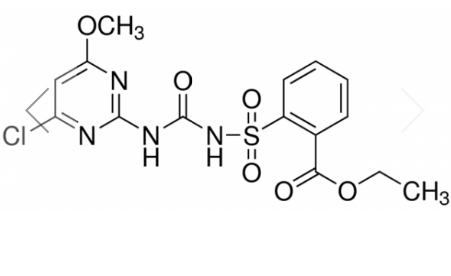 別名 氯嘧磺隆 ;豆磺隆;氯嘧黃隆,2-(4-氯-6-甲氧基嘧啶-2-基氨基甲酰氨基磺酰基)苯甲酸乙酯;Ethyl 2-(4-chloro-6-methoxy-2-pyrimidinylcarbamoylsulfamoyl)benzoate