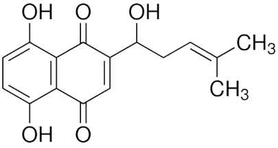 生化機理 Shikonin is a naturally occurring active chemical found in the root of Lithospermum erythrorhizon and used as a Chinese herb. The compound is a naphthoquinone derivative and has been shown to have anti-inflammatory and anti-tumor properties, as well as alter chemokine expression and function. Angiogenesis studies have shown that Shikonin can inhibit proliferation and migration of endothelial cells, block integrin αvβ3 expression, and inhibit B16 melanoma- and tumor necrosis factor-alpha-inuced angiogenesis in mice. Shikonin can down-regulate protein and mRNA expression of CKR-5 (CCR5), a primary HIV-1 coreceptor, in macrophages in HIV studies. Shikonin is an inhibitor of PKM2.