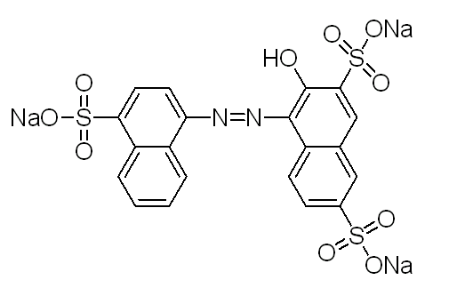 別名 莧菜紅 ;酸性紅27,萘酚紅,偶氮品紅S,波爾多紅S,1-(4′-磺基-1′-萘偶氮)-2-萘酚-3,6-二磺酸三鈉鹽,雞冠花紅,藍光酸性紅,對磺基萘偶氮-R-鹽;Acid Red 27 Azo Rubine S Bordeaux S Naphthol Red Wool Red 40 F C.I. 16185